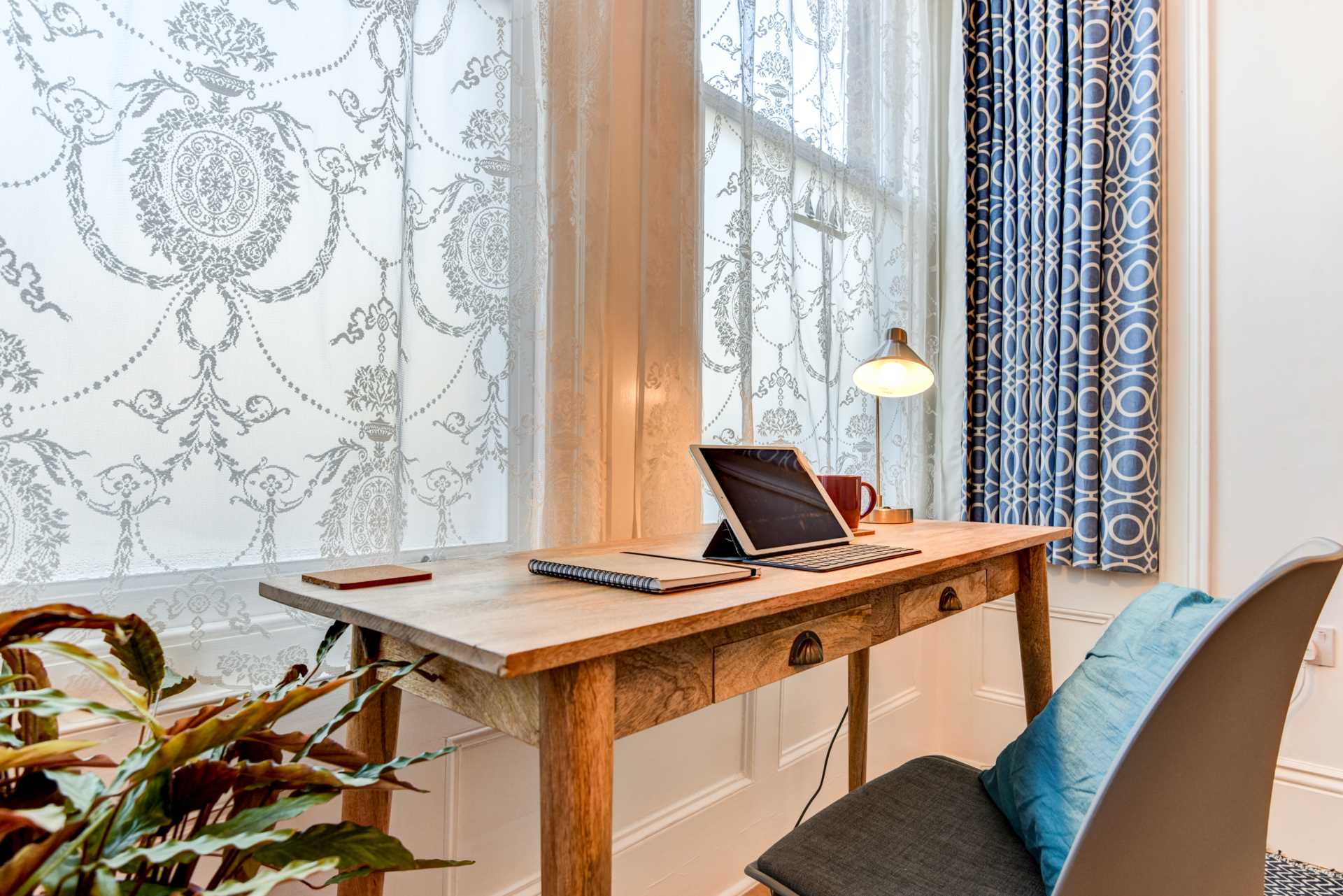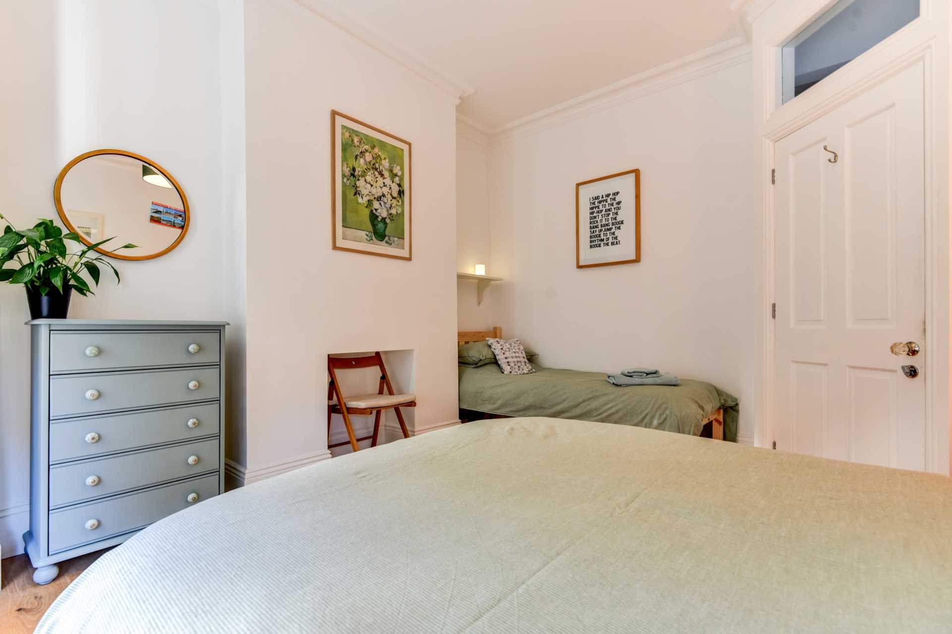 At the front of the property are two bedrooms. The main bedroom features a large kingsize bed with Simba mattress. The high ceilings and large sash windows keep the space light, whilst heavily lined curtains ensure a darkened room for a good nights sleep. The two large wardrobes provide plenty of hanging and storage space. For those needing a quiet space to work, there is also desk space in the bedroom, and the wifi extenders mean there is good reception throughout the property. The second bedroom features 2 beds. The main bed is a standard double with medium-firm mattress and the second bed is a small single (75 cm x 190cm). There is a chest of drawers and bedside table in the room, with additional bedding in the wardrobes of the main bedroom. A travel cot is available on request.